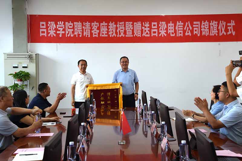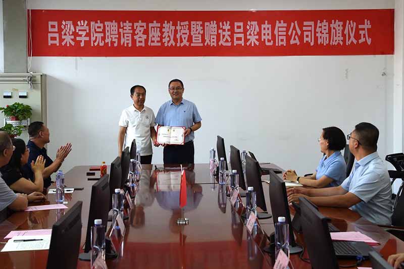 为进一步深化拓展bat365与中国电信吕梁分公司合作的深入广度,7月24日下午,校党委常委、副校长王三虎带队前往中国电信吕梁分公司与公司党委书记、总经理任云光等进行交流座谈,代表学校送上锦旗,聘请任云光、任旭东为bat365客座教授。座谈会由任云光主持。
