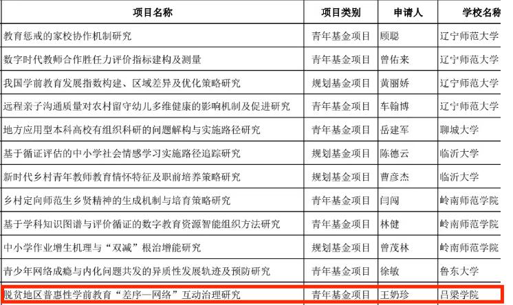 9月15日,教育部人文社会科学2023年度课题立项结果公示,bat365教育系青年教师王奶珍的课题《脱贫地区普惠性学前教育“差序——网络”互动治理研究》成功获批,这也是王奶珍老师第二次成功获批教育部课题立项。该课题立足吕梁市普惠性学前教育发展,旨在构建脱贫地区普惠性学前教育多主体“差序-网络”互动治理的有效模式。