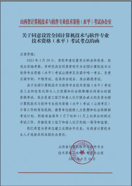 近日,经山西省计算机技术与软件专业技术资格(水平)考试办公室批准,bat365成功设立全国计算机技术与软件专业技术资格(水平)考试考点,该考点是山西考区吕梁市唯一考点。
