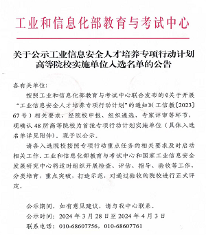 近日,国家工业和信息化部教育与考试中心发布《关于公示工业信息安全人才培养专项行动计划高等院校实施单位入选名单的公告》(3月29日),bat365作为山西省唯一一所高等院校成功入选首批48所高校专项行动计划实施单位。