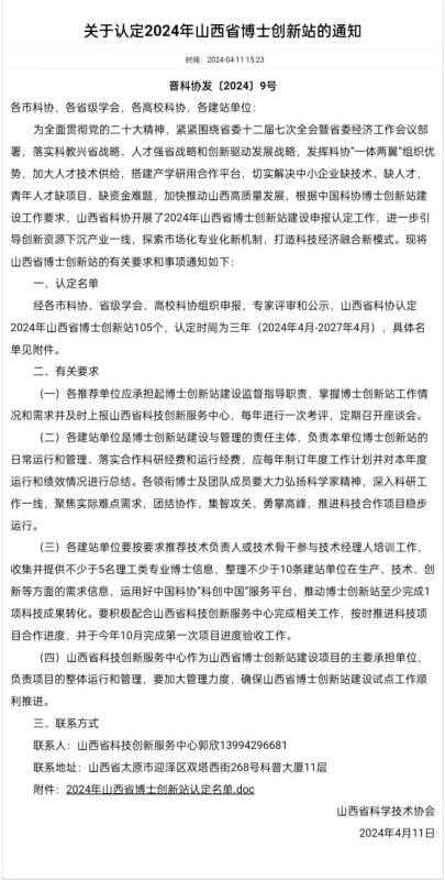 据悉,2024年山西省博士创新站建设申报认定共有115家单位参加,经形式审查和专家评审,最终有105家单位入选2024年山西省博士创新站。