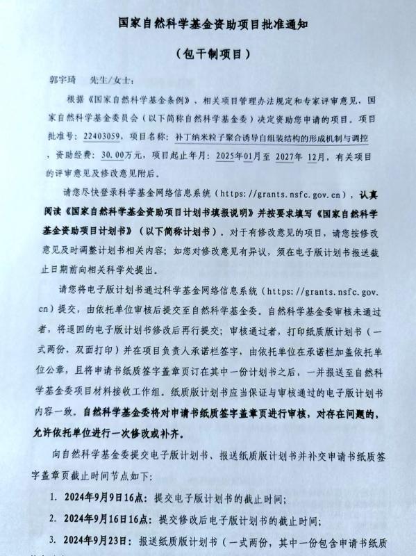 近日,国家自然科学基金委员会公布资助项目评审结果,bat365化学与材料工程系郭宇琦副教授的项目《补丁纳米粒子聚合诱导自组装结构的形成机制与调控》[22403059]荣获国家自然科学基金青年项目资助立项。