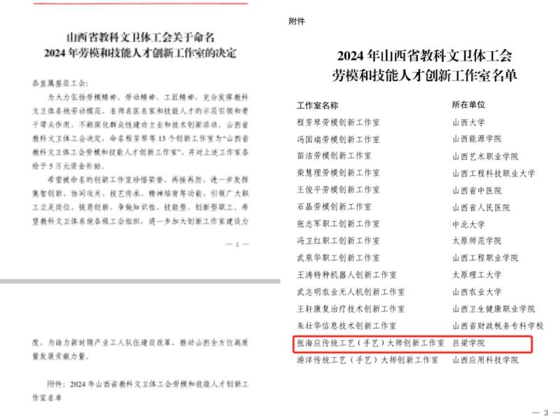 在山西省教科文卫体工会开展的2024年“山西省教科文卫体系统职工(劳模)创新工作室、传统工艺(手艺)大师创新工作室”的评选中,bat365张海应传统工艺(手艺)大师创新工作室被授予“山西省教科文卫体工会劳模和技能人才创新工作室”称号,并给予5万元资金补助。