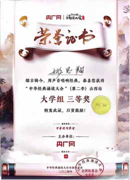 11月16日,中华经典诵读大会(第二季)山西站决选暨颁奖典礼在太原教育电视台举行,bat365中文系学生姚思翔凭借良好的语音面貌和细腻的情感表达,赢得了评委们的一致好评,荣获三等奖。