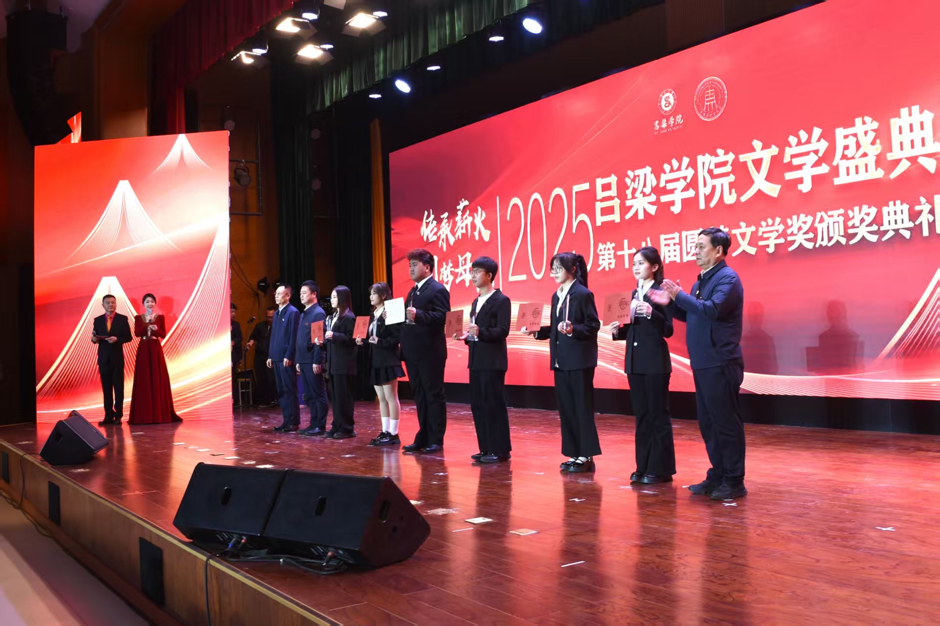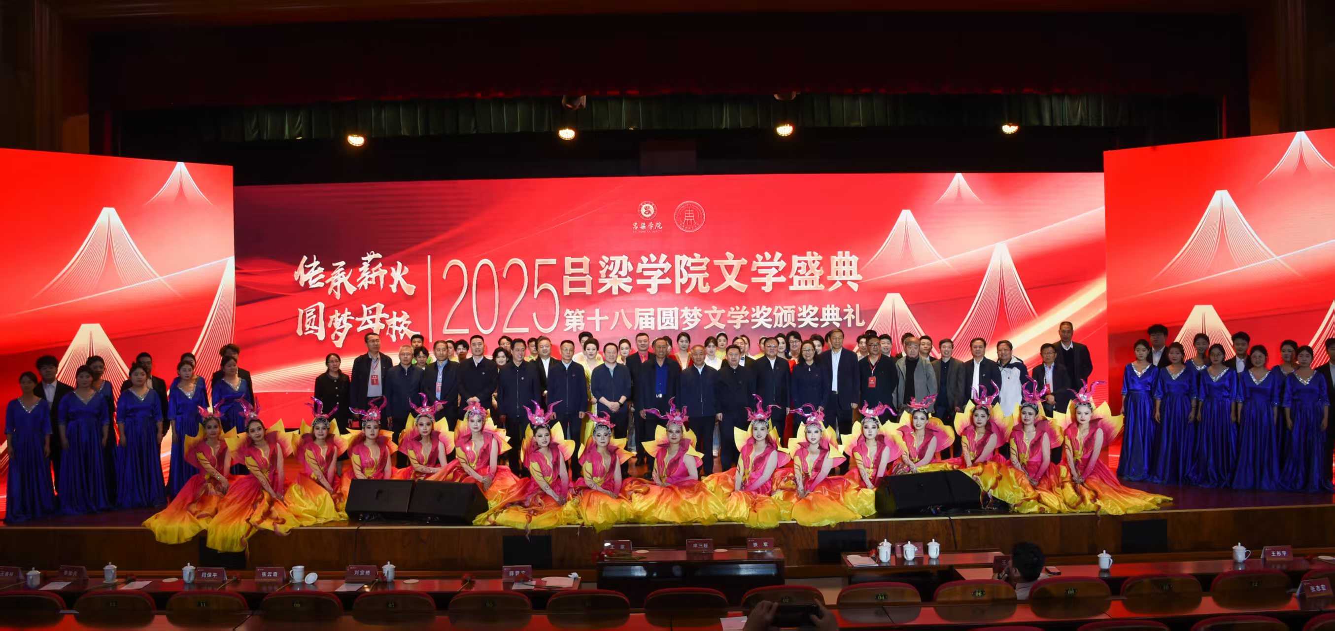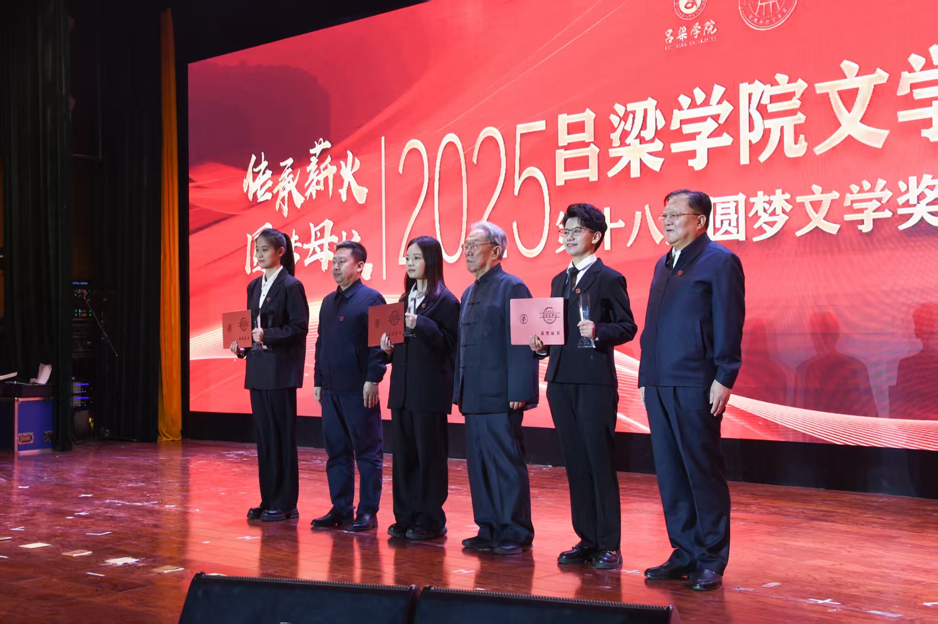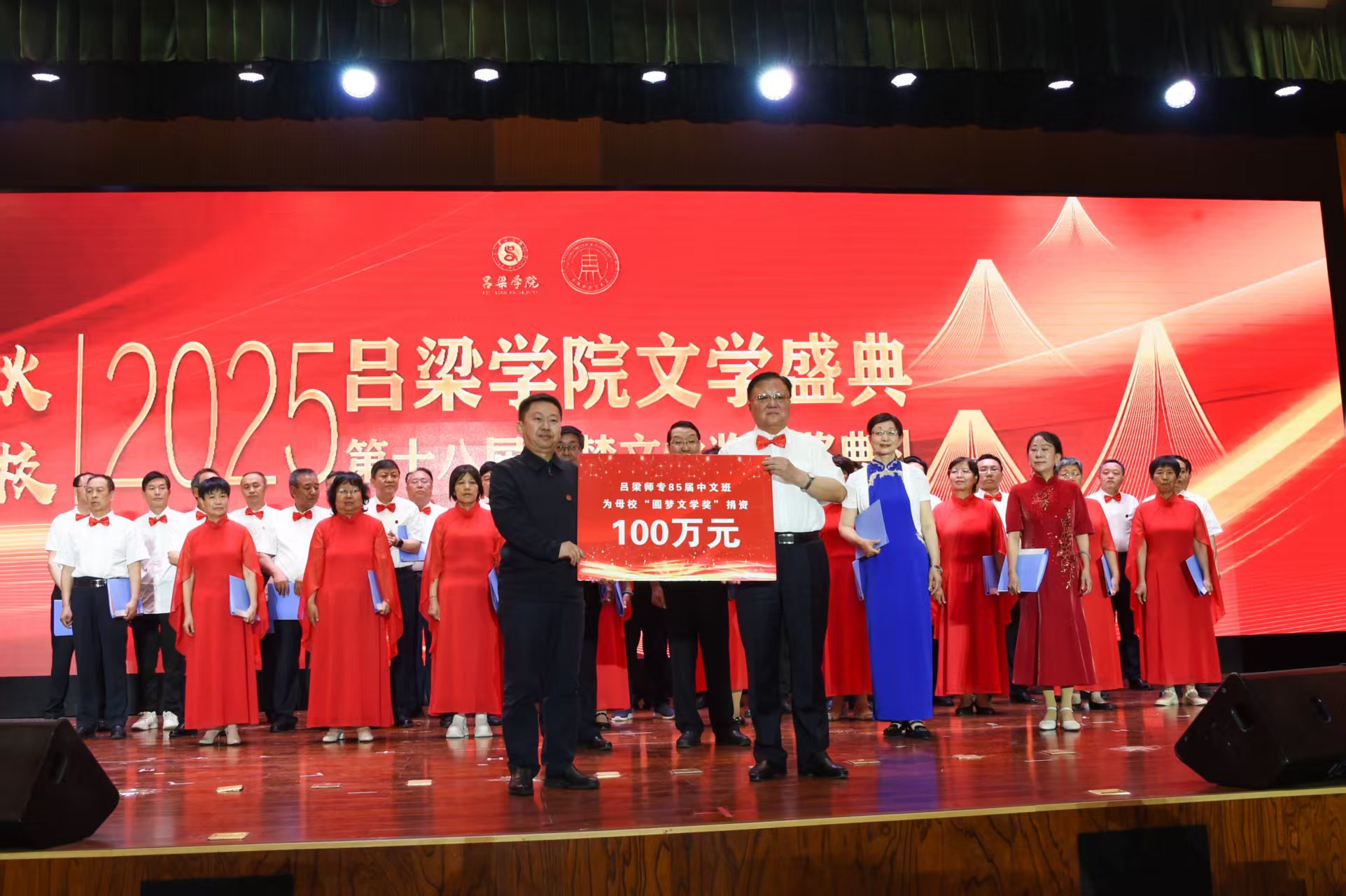颁奖典礼上,吕梁师专85届中文班为母校“圆梦文学奖”捐赠100万元;铁军代表学校向八五届中文班赠予“杰出校友班”牌匾,并赠送题有“传承薪火德立梦圆”的字幅。
