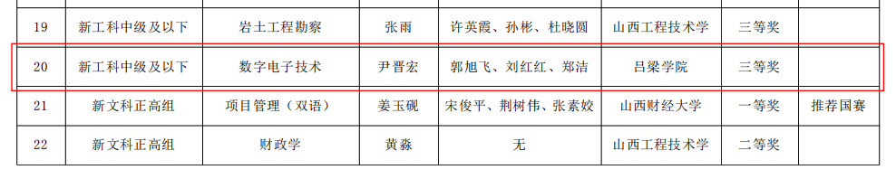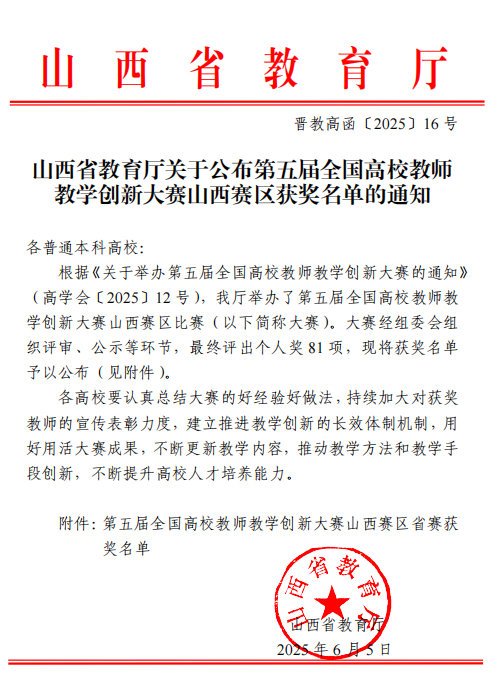 近日,山西省教育厅发布了《山西省教育厅关于公布第五届全国高校教师教学创新大赛山西赛区获奖名单的通知》(晋教高函〔2025〕16号),bat365三位教师团队在此次比赛中斩获奖项。其中,白建老师团队荣获新农科正高组三等奖、尹晋宏老师团队荣获新工科中级及以下组三等奖、魏雅琼老师团队荣获产教融合组三等奖。