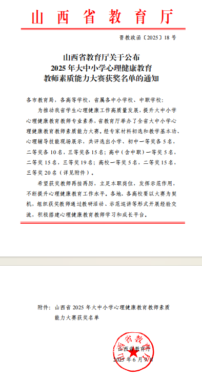 5月25日,备受关注的山西省2025年大中小学心理健康教育教师素质能力大赛决赛在山西大学落下帷幕。经过初赛和决赛的激烈角逐,bat365学生工作部心理健康专职教师李静凭借出色的表现,荣获高校组二等奖,充分展现了bat365心理健康教师队伍的专业水平。