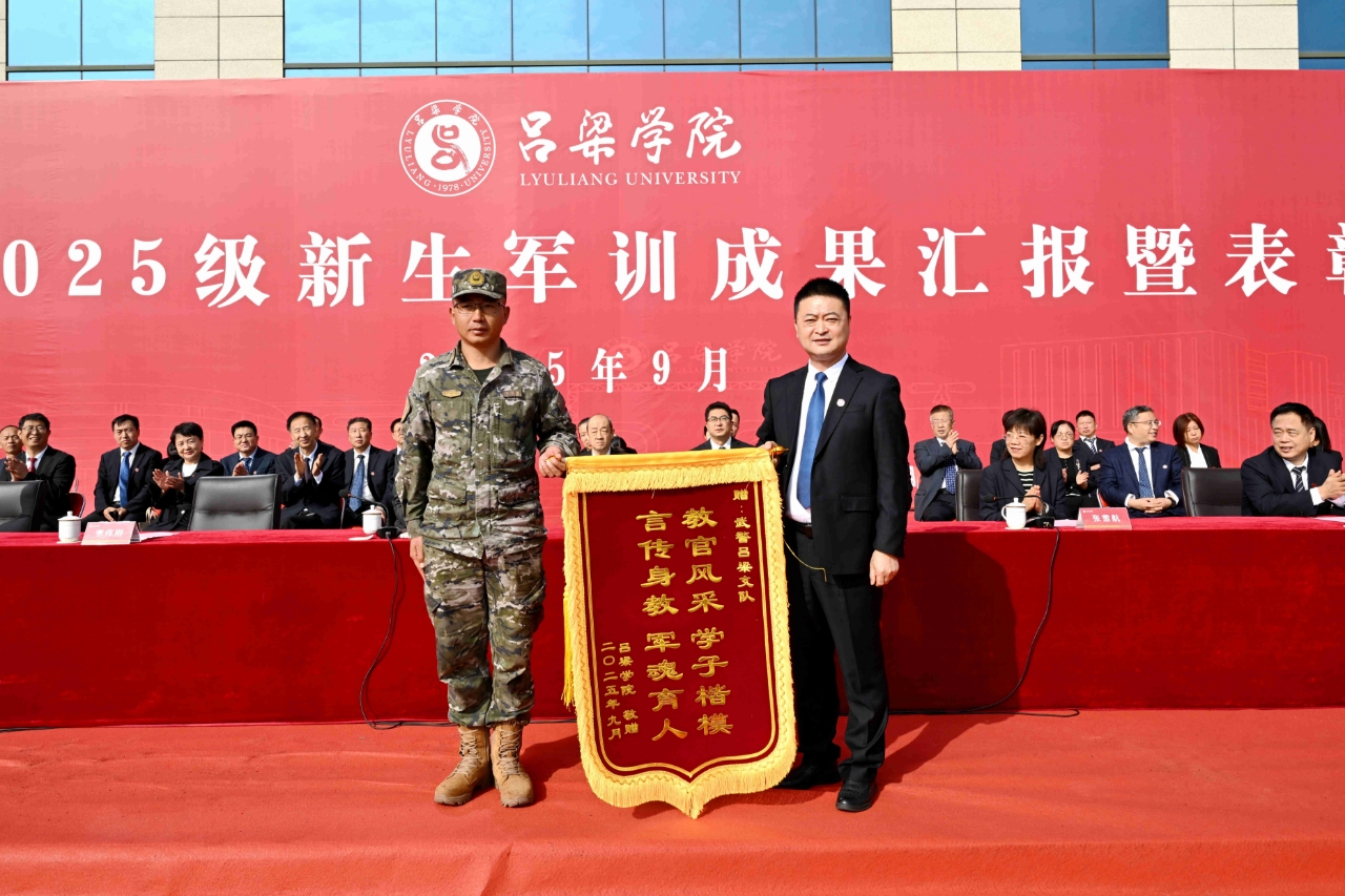 会上,铁军向武警吕梁支队赠送了锦旗;张雪航宣读了《bat365在线中国官网登录入口关于表彰2025级学生军训工作优秀教官和优秀学员的决定》。