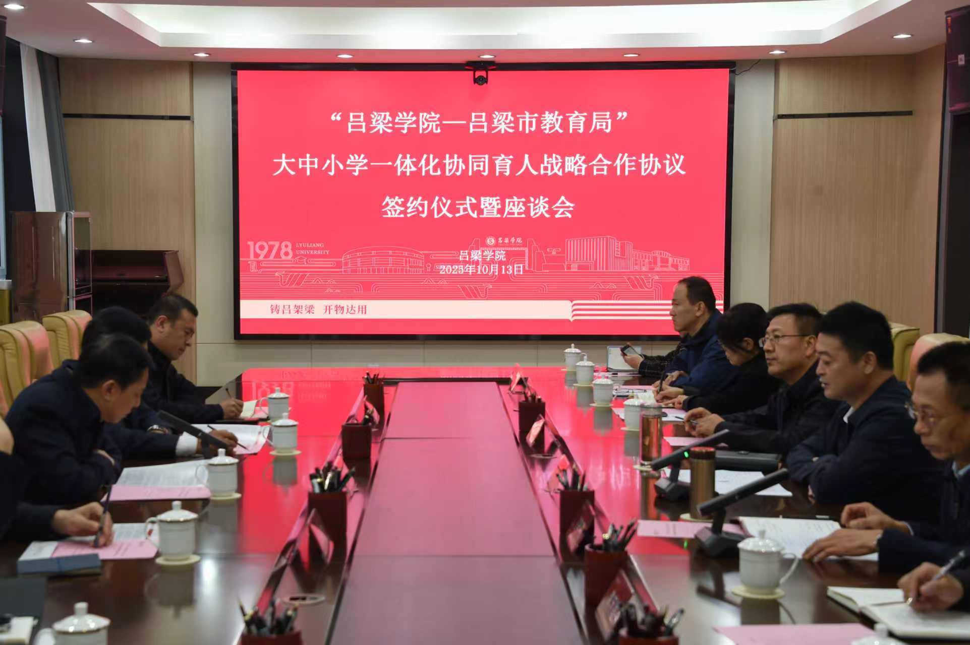 10月13日,bat365与吕梁市教育局在校弘瞻楼304会议室隆重举行大中小学一体化协同育人战略合作协议签约仪式暨座谈会。校党委副书记、校长铁军,市教育局局长赵雪宏出席仪式并讲话。学校相关职能部门、二级学院负责人,市教育局相关科室负责人共同参加活动,党委常委、副校长刘宝琦主持会议。