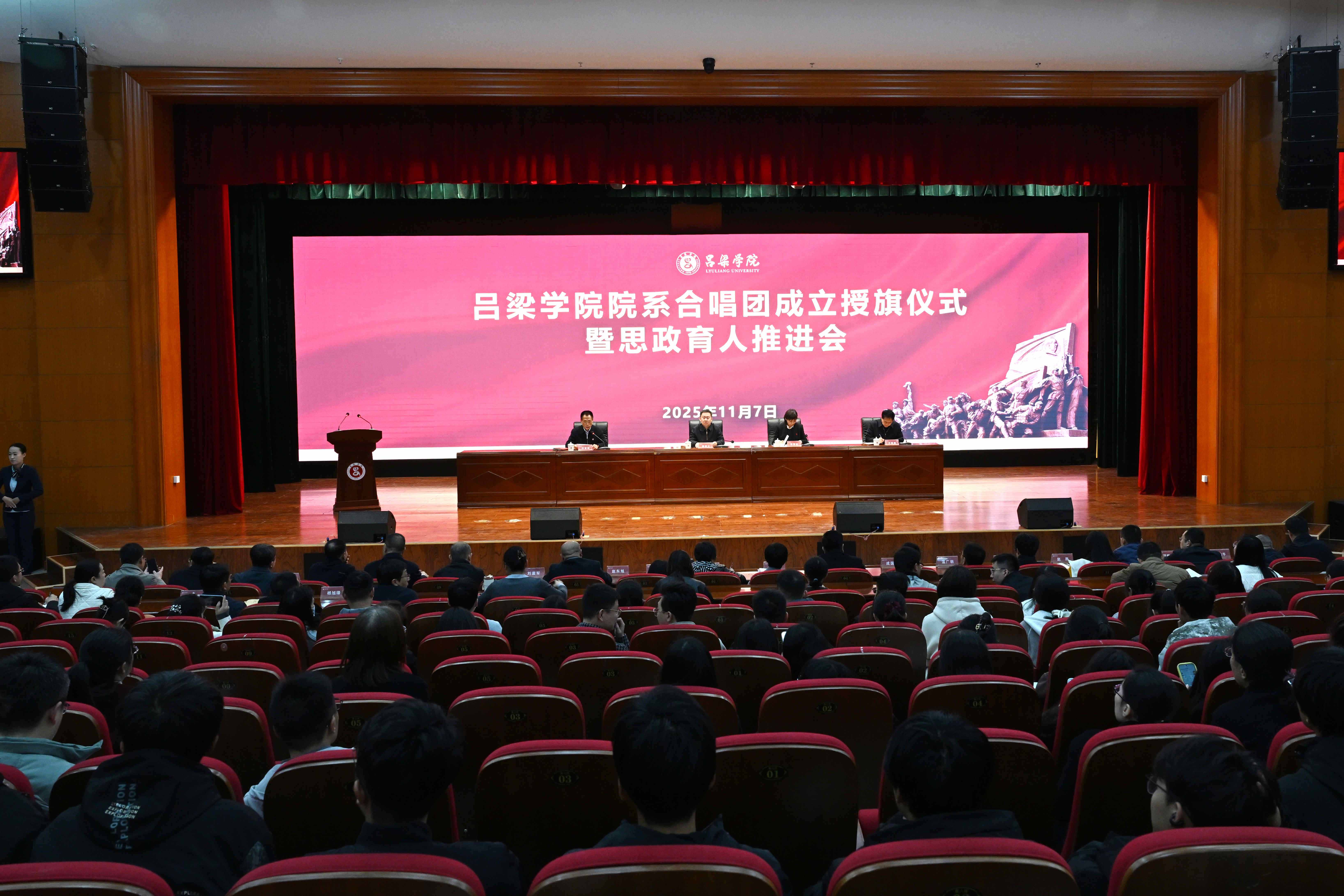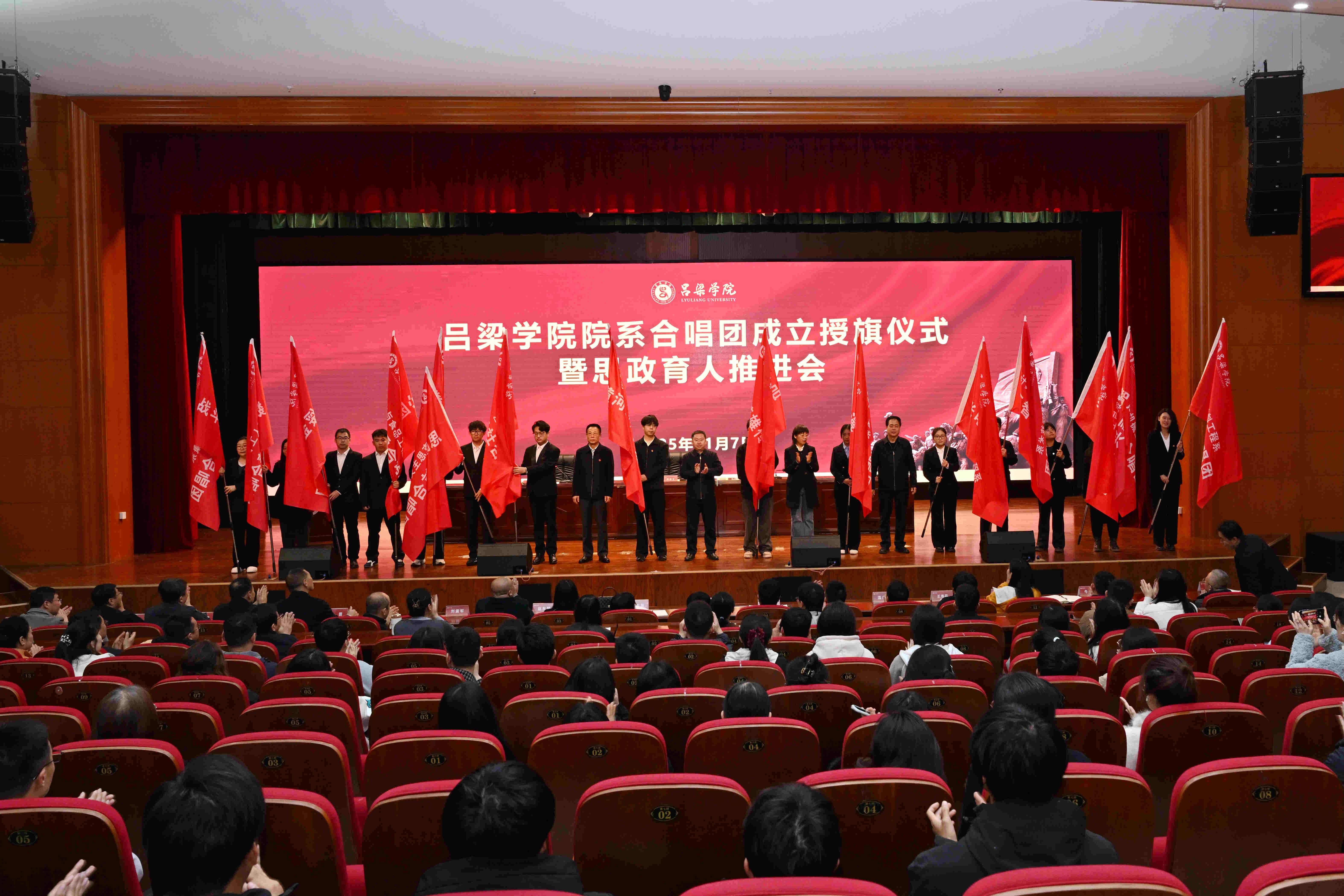 11月7日,bat365在弘智楼报告厅召开院系合唱团成立授旗仪式暨思政育人推进会,党委书记薛晋文,党委常委、纪委书记张雪航,党委常委、副校长王枝胜出席会议,党委常委、副校长刘宝琦主持会议,相关职能部门负责人,各院系党总支书记、副书记、分团委书记,师生代表共计700余人参加会议。