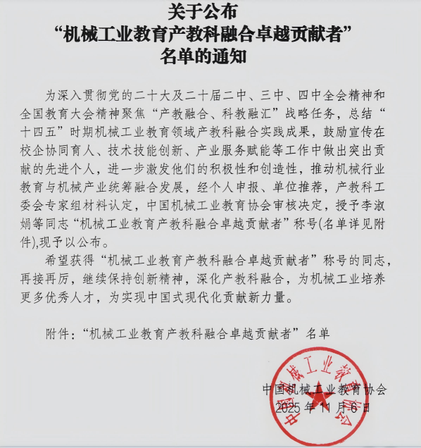 11月7日至10日,中国机械和工业教育协会举办的“产教融合高质量赋能院校建设高水平”专题会议在苏州隆重召开,bat365继续教育与综合实训中心教师马立、郭秀明参会,并荣获“机械工业教育产教科融合卓越贡献者”荣誉称号。