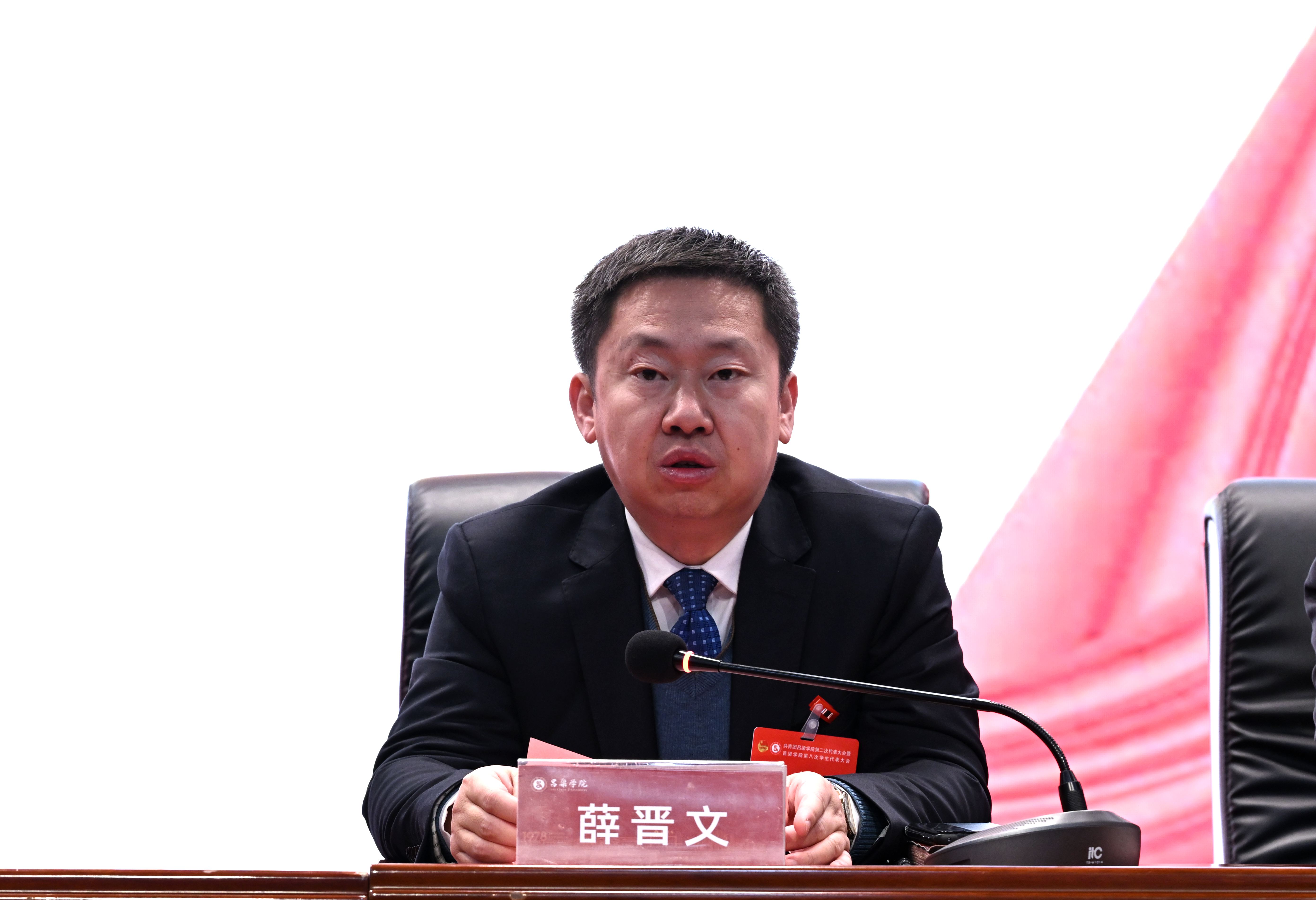 薛晋文代表校党委和全体师生员工,向大会的胜利召开表示祝贺,向莅临指导的领导、嘉宾表示感谢,向全体代表,以及全校广大团员青年、青年学生致以问候和祝愿。他对全校青年提出四点希望:一是铸牢政治忠诚,在坚定信念中把准青春方向;二是锤炼过硬本领,在勤学实干中积蓄青春力量;三是勇于担当作为,在服务大局中绽放青春光彩;四是涵养高尚品德,在砥砺修行中擦亮青春底色,在建设“晋西名校、红色学府、一流高校”的征程中勇当先锋,在全面建设社会主义现代化国家的伟大实践中书写无愧于时代、无愧于人民、无愧于青春的壮丽篇章。