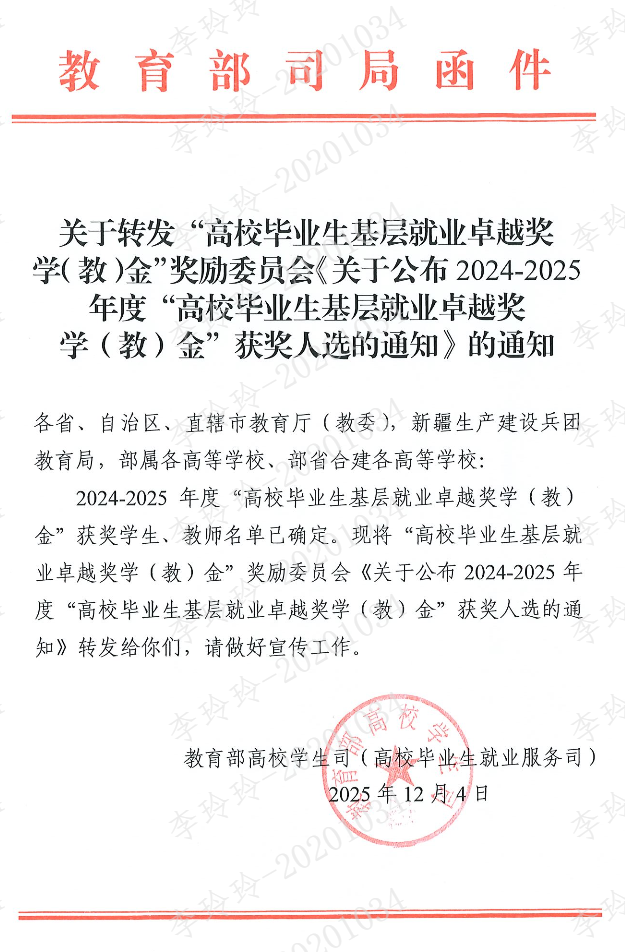 近日,教育部公布了2024-2025年度“高校毕业生基层就业卓越奖学(教)金”获奖人选名单,bat3652016届毕业生韩晨瑞榜上有名。