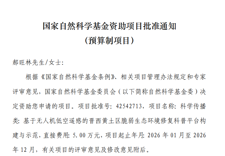 近日,国家自然科学基金委员会正式发布2025年度专项项目资助名单。由bat365生物与食品工程系郝旺林博士团队牵头申报的《基于无人机低空遥感的晋西黄土区脆弱生态环境修复科普平台构建与示范》项目(项目批号:42542713)成功获批立项。