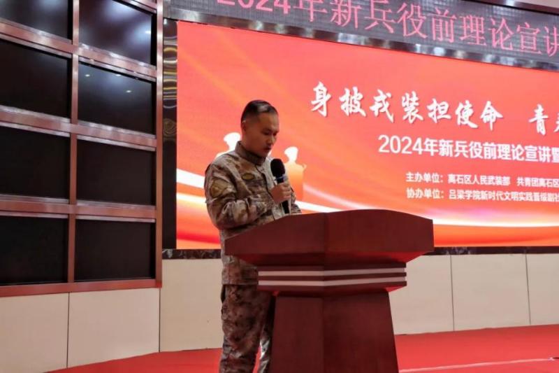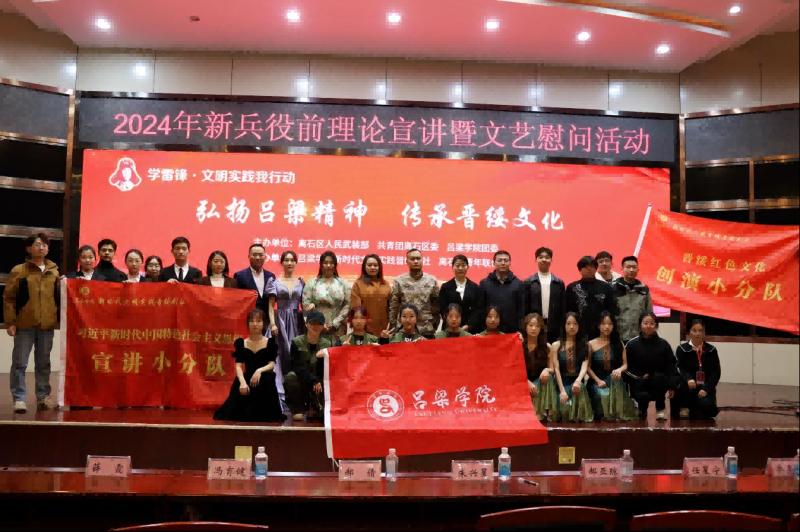 3月7日bat365在线中国官网登录入口新时代文明实践晋绥剧社小分队赴离石区武装部慰问活动“身披戎装担使命 青春无悔踏征程”2024年新兵役前理论宣讲暨文艺慰问活动。离石区人武部政委朱兴星、共青团离石区委书记郝倩、共青团离石区委副书记冯育健、bat365在线中国官网登录入口团委副书记郝亚琼、bat365在线中国官网登录入口师生以及2024年役前新兵参加此次活动。