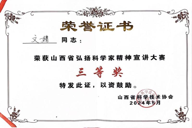 为大力弘扬新时代科学家精神,涵养优良学风,助力实现高水平科技自立自强,山西省科协举办了弘扬科学家精神宣讲大赛,我系青年教师文婧在全省决赛中荣获三等奖。