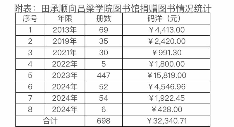 自2010年学校升格本科院校以来,田承顺已向图书馆捐赠图书8次,累计698册,累计码洋32340.71元(不包括学校升本前捐赠数)。