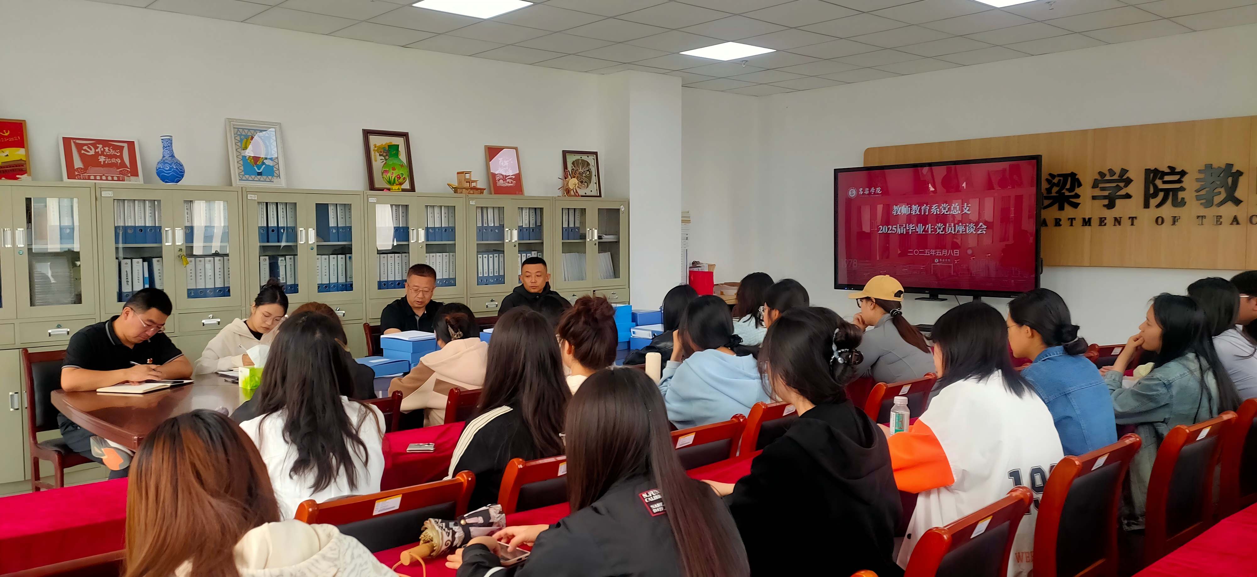 5月8日,教师教育系党总支在党员活动室召开2025届毕业生党员座谈会。系领导班子成员、学生党支部书记、2025届毕业生党员参加会议。