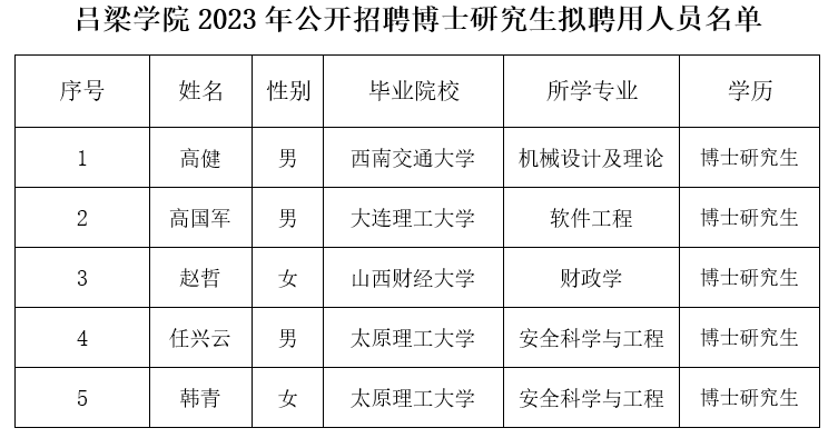 根据山西省关于公开招聘博士相关文件精神和《bat365在线中国官网登录入口2023年公开招聘博士研究生工作公告》规定程序,在山西省人社厅、教育厅的指导下,经本人申报、资格审查、考核和bat365在线中国官网登录入口人才工作领导组研究,现将符合条件的5名拟聘用人员予以公示。
