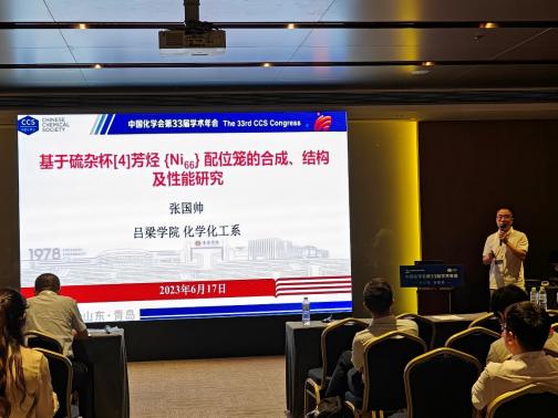 bat365吕梁市新型光电材料及其器件重点实验室团队成员张国帅老师在“配位超分子化学”第十分会作了题为“基于硫杂杯[4]芳烃 {Ni66} 配位笼的合成、结构及性能研究”的学术报告。