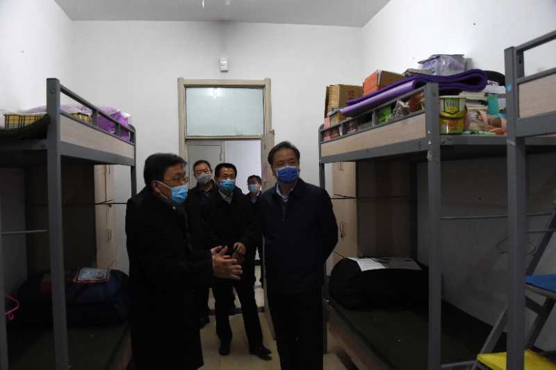 王东边走边听取了周富国就学校疫情防控工作情况的汇报,依次对校园门卫、公寓、工科楼实验室、怡丁轩大学生餐厅、校医院、防控物资管理等重点部位现场一一进行了督导调研,每到一处,他都要认真查看、详细了解防控措施落实情况并提出相关督导意见。