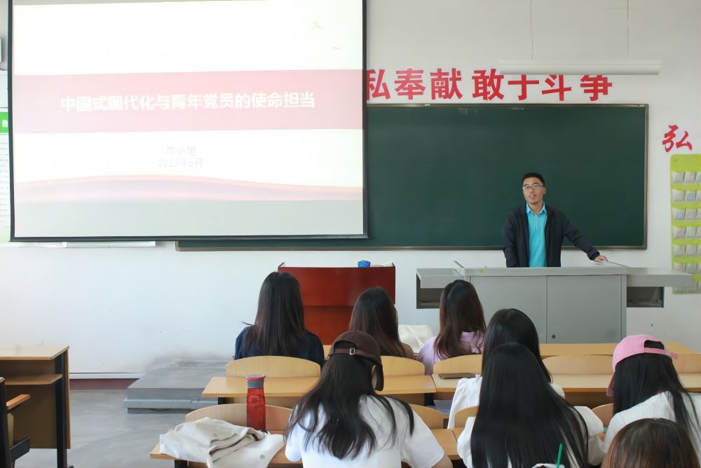 为学习贯彻党的二十大精神,深入开展学习贯彻习近平新时代中国特色社会主义思想主题教育,践行“学思想、强党性、重实践、建新功”总要求,6月2日,思政系学生党支部书记李小旭以“中国式现代化与青年党员的使命担当”为主题,为学生党员讲授主题教育专题党课。