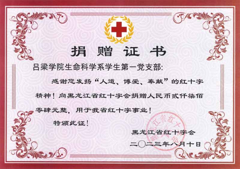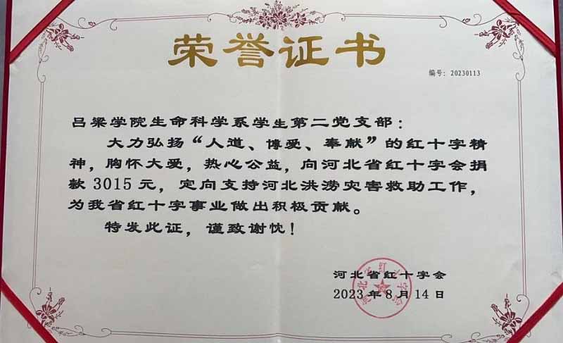 一方有难,八方支援。近期受台风暴雨天气影响,河北、黑龙江,引发山洪等地质灾害,抗洪抢险形势严峻。面对这突如其来的汛情灾害,学生党支部闻“汛”而动,号召全体学生党员、入党积极分子积极开展抗灾捐款活动,本着情系灾区、心系百姓的家国情怀,时刻关注河北、黑龙江汛情的最新动态,以党建带团建。在短短几天时间内,全系学生党员、入党积极分子、以及积极向党组织靠拢的学生们纷纷响应、积极捐款。先后向河北红十字会捐款3015元,黑龙江红十字会捐款2704元,用行动显担当,用爱心传递奉献情怀,帮助受灾地区群众渡过难关,以实际行动践行社会主义核心价值观。